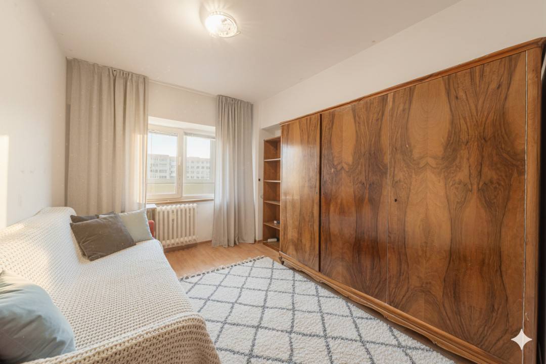 Apartamentul pe care vi-l propunem se remarcă prin lumină, spațiu și o poziționare de excepție, fiind scăldat de soare pe tot parcursul zilei. Situat pe Șoseaua Colentina nr. 2, chiar lângă efervescența zonei Bucur Obor, oferă o suprafață utilă totală de aproximativ 70 mp și o compartimentare decomandată, perfect gândită pentru confort și funcționalitate. Interiorul este deschis de un hol generos care asigură acces către toate încăperile, iar în partea dreaptă se află livingul spatios, prelungit printr-un balcon dispus pe toată lungimea apartamentului, balcon ce acoperă și cele două dormitoare, aducând un plus de izolare termică și fonică.